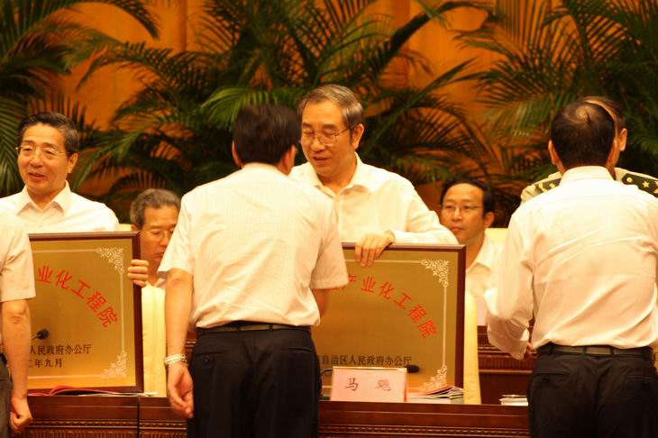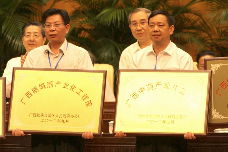 馬步副總經(jīng)理(前左)接過廣西朗姆酒產(chǎn)業(yè)化工程院授牌