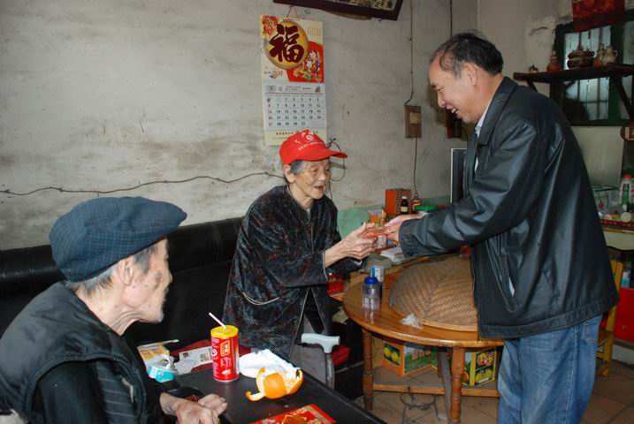 圖為良圻制糖慰問組到退休職工家中慰問的情景。(莫燕選攝)