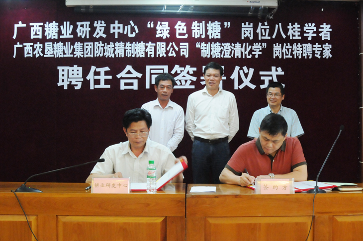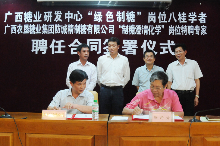 簽署儀式上,馬步副總經(jīng)理與梁達(dá)奉教授等“綠色制糖”崗位八桂學(xué)者、防城精制糖有限公司董事長李強(qiáng)與“制糖澄清化學(xué)”崗位特聘專家劉和清教授簽署聘任合同。