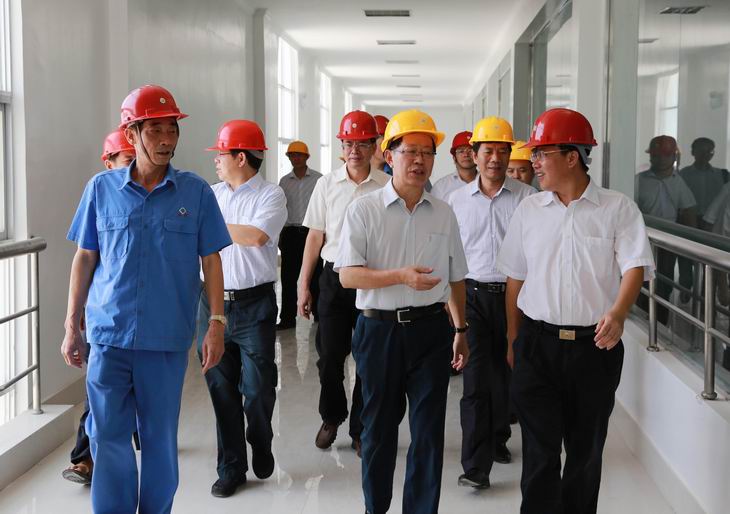 圖為自治區(qū)黨委副書記危朝安(前排右二)到即將竣工的朗姆酒精品觀光生產(chǎn)線現(xiàn)場(chǎng)視察的情景