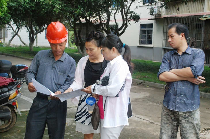 近日,良圻制糖有限公司組織危房改造工作組人員、職工代表和施工方代表,對(duì)該公司實(shí)施的危房改造工程進(jìn)行初步驗(yàn)收,責(zé)令施工方馬上對(duì)存在的問(wèn)題進(jìn)行整改,確保改造效果和施工質(zhì)量達(dá)到規(guī)劃要求,以便驗(yàn)收結(jié)算和歸檔管理。圖為工作人員和施工方代表在對(duì)危房改造項(xiàng)目進(jìn)行現(xiàn)場(chǎng)驗(yàn)收的情景。(李立榮攝)