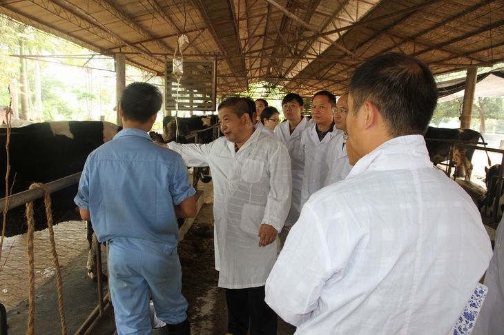圖為曹兵海教授在乳業(yè)公司奶牛場(chǎng)實(shí)地考察并與技術(shù)人員交流奶牛疾病防控技術(shù)的情景。(麻華飛 譚長(zhǎng)歡)
