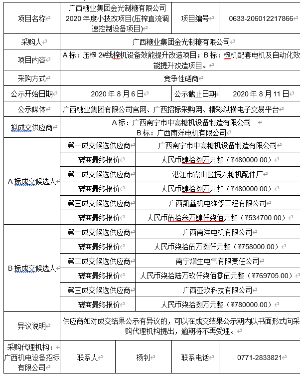 上一篇:廣西建隆工程咨詢有限公司 廣西糖業(yè)集團(tuán)金光制糖有限公司2020年小技改項(xiàng)目(制煉車間煮糖罐新增強(qiáng)制攪拌器項(xiàng)目)(項(xiàng)目編號:GXJL-2020-52)成交結(jié)果公告