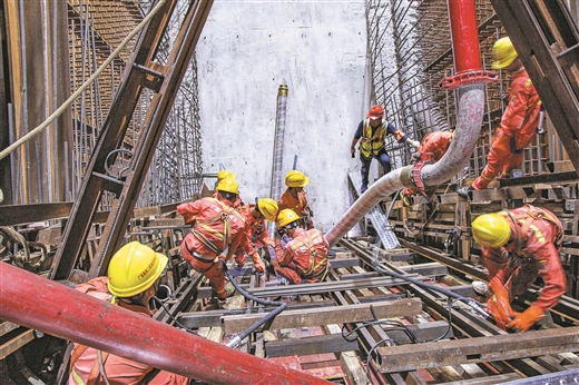 在天峨龍灘特大橋建設(shè)現(xiàn)場,廣西路橋集團(tuán)黨員干部發(fā)揮模范帶頭作用全力推進(jìn)施工進(jìn)度。 呂春芳/攝