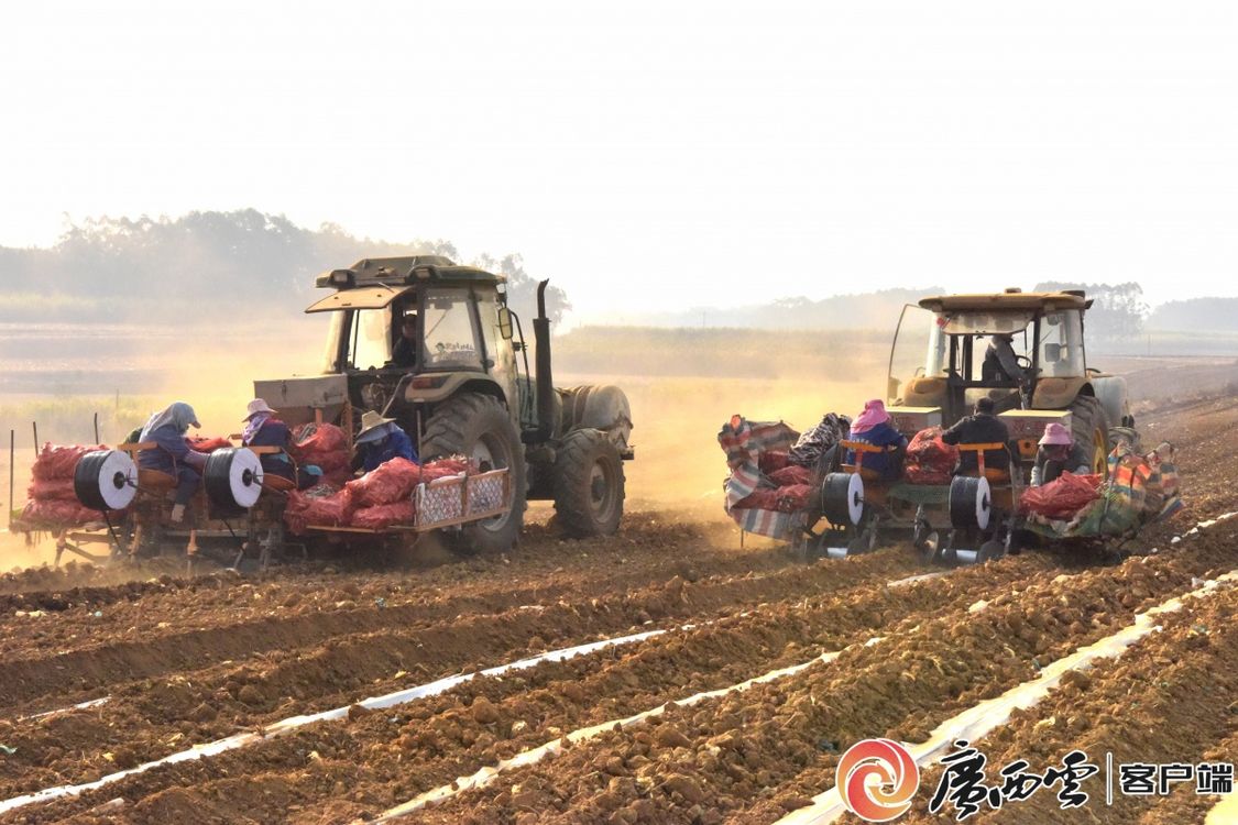 廣西糖業(yè)集團(tuán)金光制糖公司蔗區(qū)力推甘蔗機(jī)械化種植,圖為蓋膜現(xiàn)場(chǎng)。 韋志仙 攝